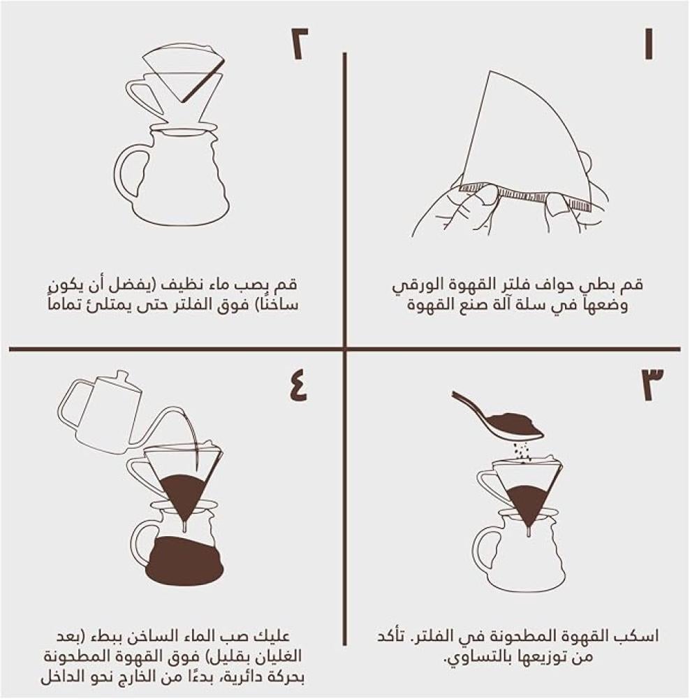 - ✔️【قبل التحضير】قبل إضافة القهوة، قم بغسل الفلتر بالماء الساخن. سيساعد ذلك في إزالة أي طعم ورقي قد ينتقل إلى قهوتك. تذكرأن هذه الخطوة اختيارية ولا يقوم بها الجميع. ومع ذلك، يمكن أن يحسن من مذاق قهوتك عن طريق إزالة أي طعم ورقي محتمل.